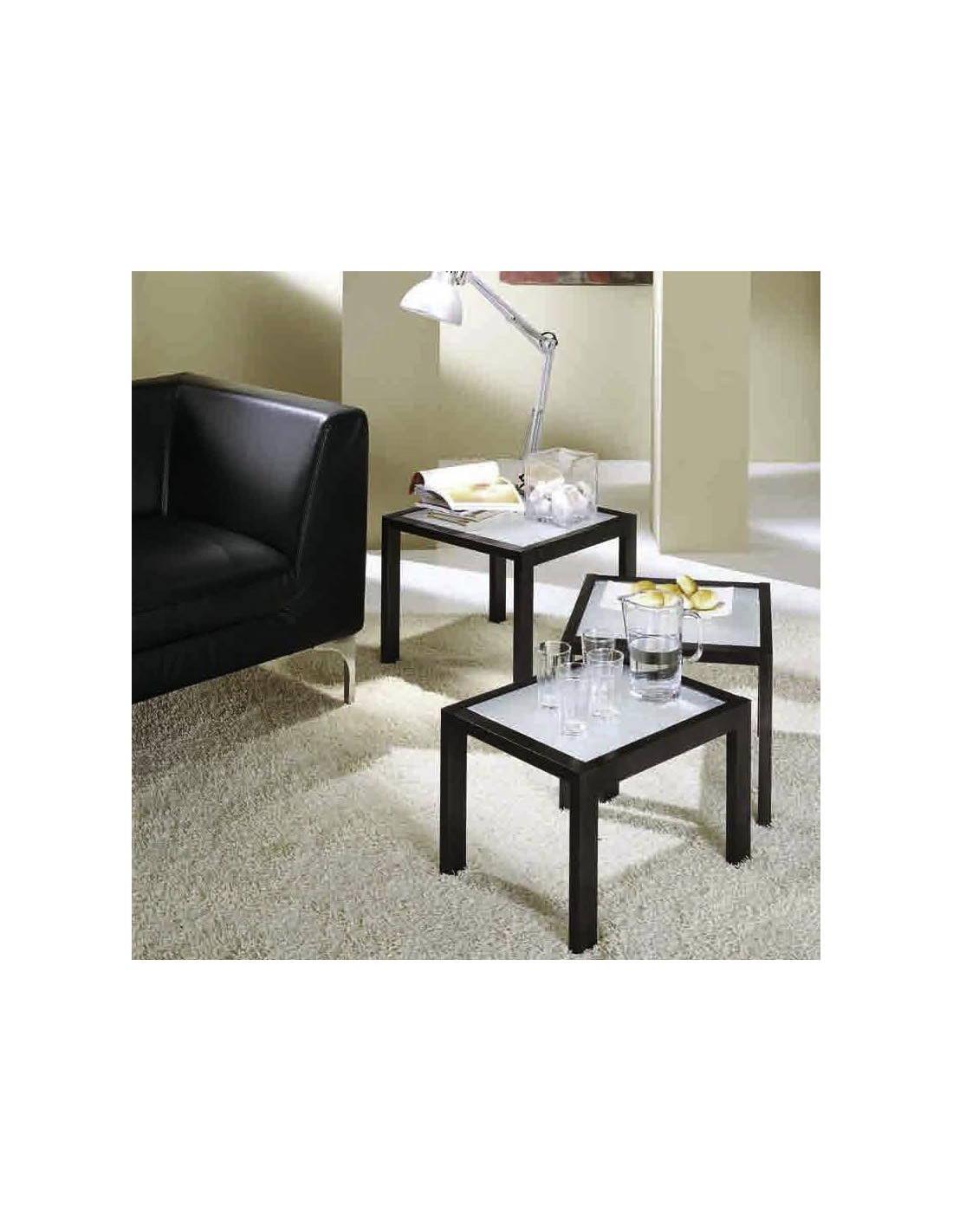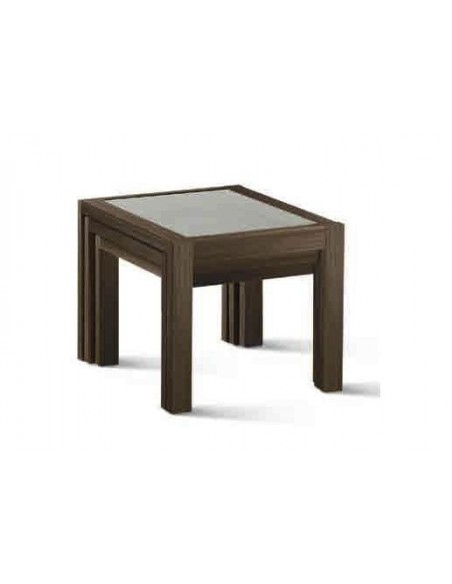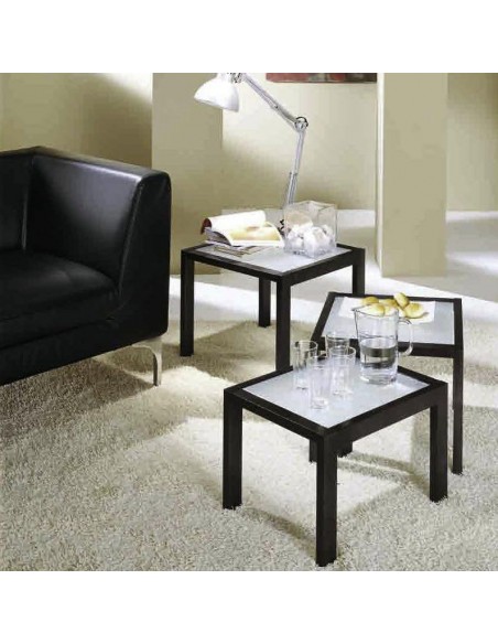 Trio of wooden tables covered with melamine, with glass tops frosted. Available in different finishes, Trio revives the hall and is suitable to be placed artfully when needed, then can easily be reassembled into a small space as needed.