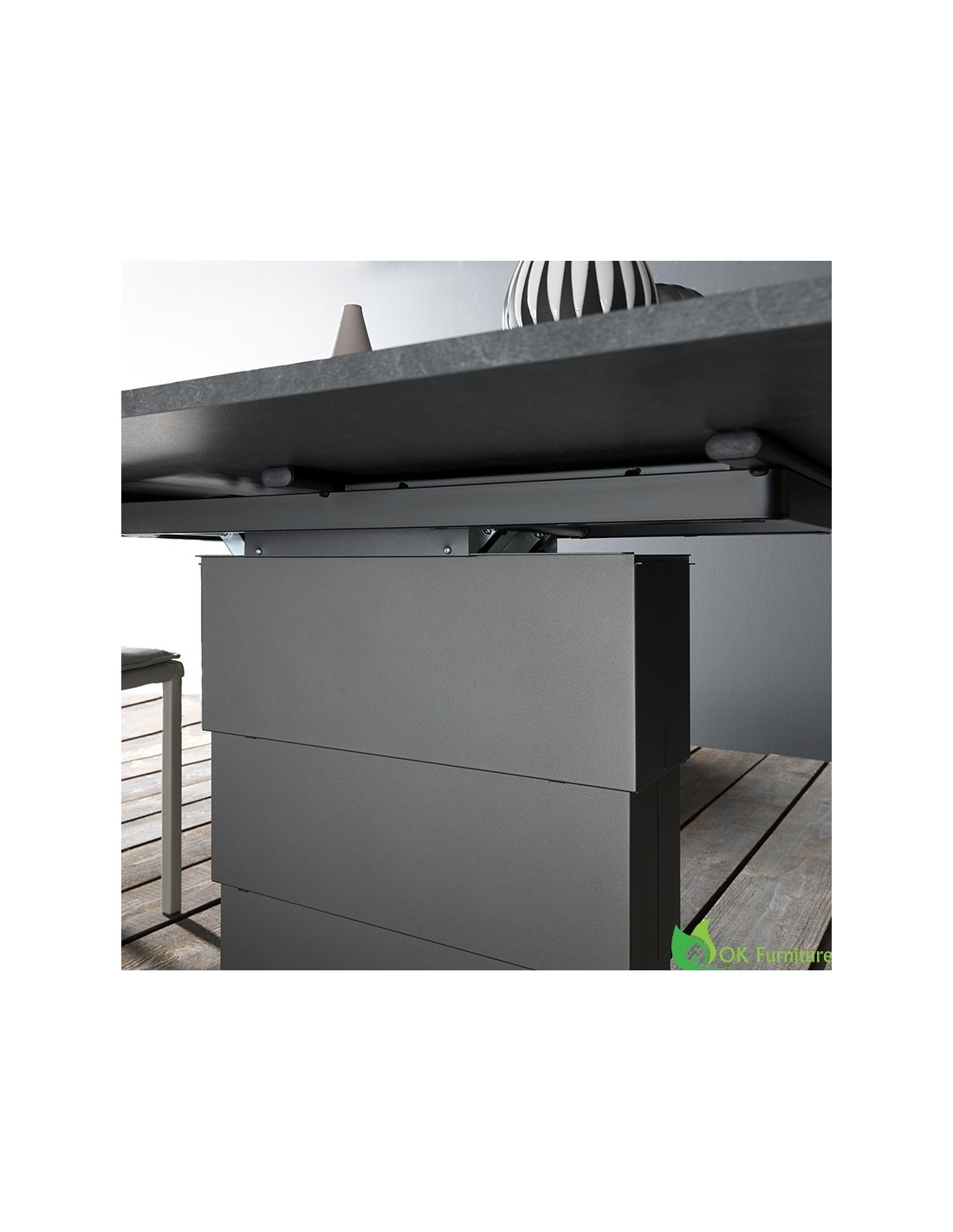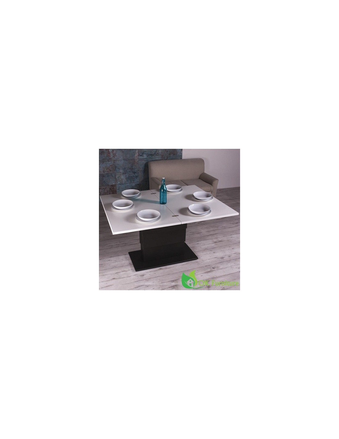 Transforming coffee table, it turns into a dining table, steel central column, gas or electric with rechargeable battery lifting device. Millimetre-adjustable height from cm 39 to cm 79, folded doubling top in melamine, glass, lacquered, stained wood, mortar-look or ceramic. Hidden under- plate castors.