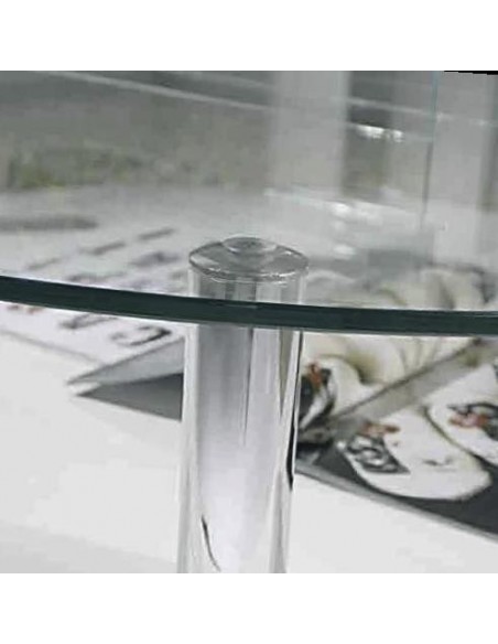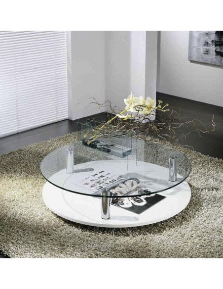 Tavolino rotondo in legno rivestito melaminico con piano in cristallo trasparente.