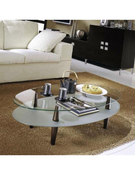 Tavolino ovale in legno con doppio piano in cristallo.