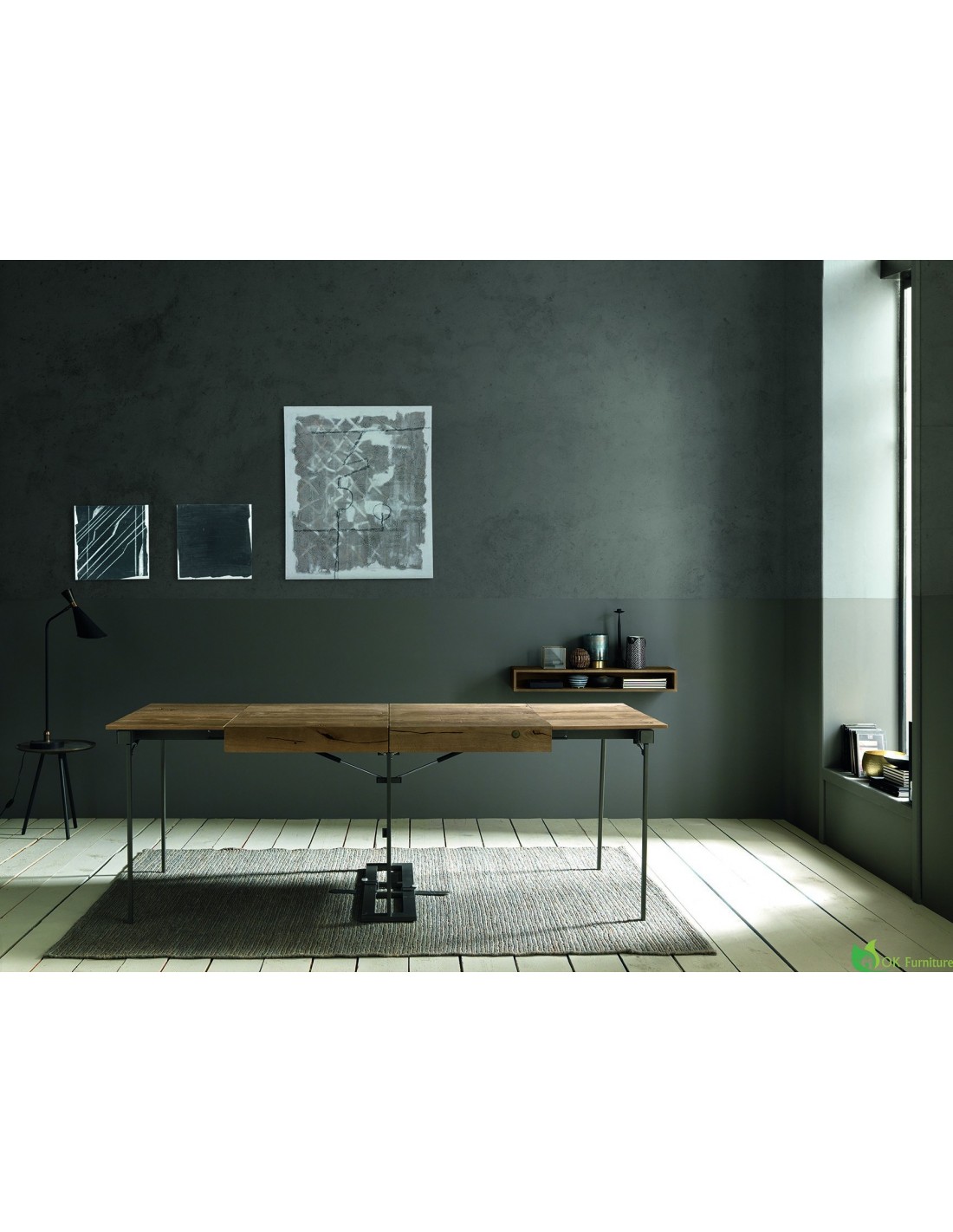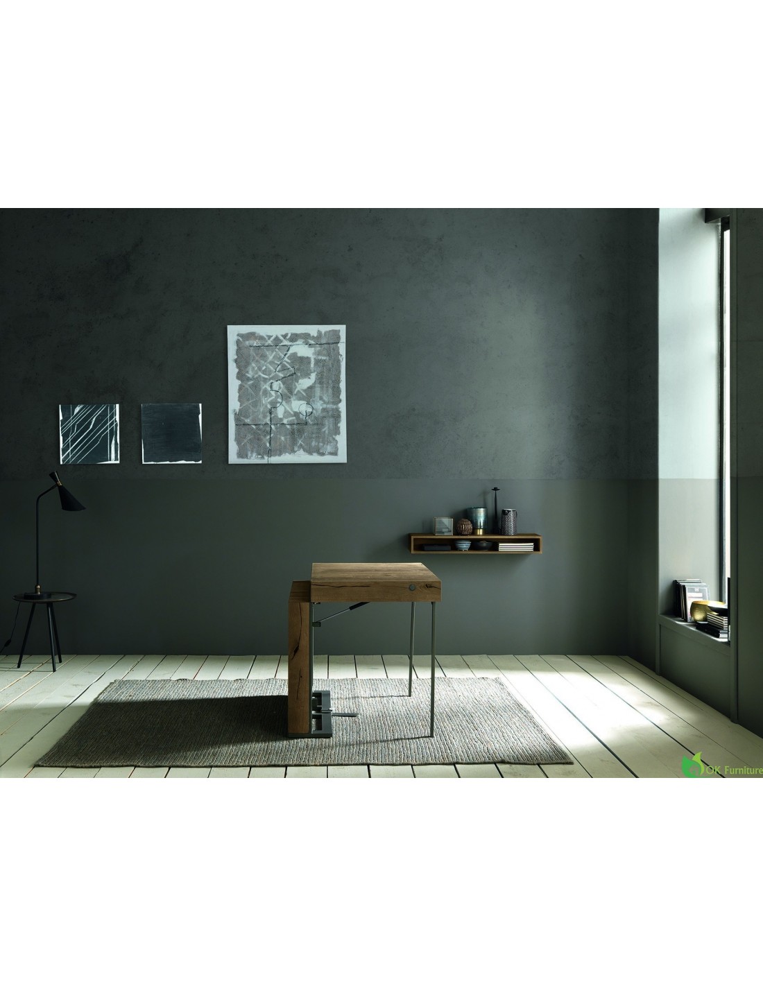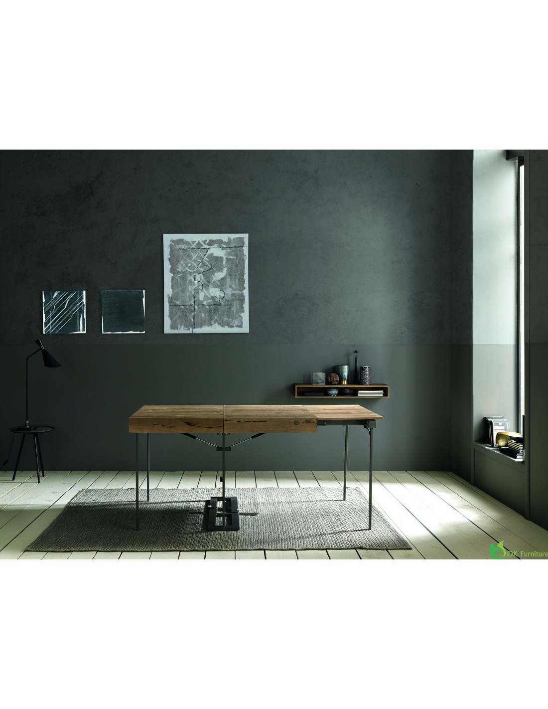 Geniale, come il nome a cui si ispira, da vinci è un complemento d’arredo originale ed esclusivo, ma se a prima vistala sua forma compatta evoca una valigia, il viaggio che é in grado di intraprendere é sorprendente. Un piccolo spostamento dalla parete in centro stanza e pochi movimenti trasformano una consolle in un praticissimo tavoloda pranzo: la struttura leggera, ma estremamente stabile, sorregge il piano realizzato in rovere massiccio dall’aspetto estetico vintage che suggerisce l’esperienza in “materia”.