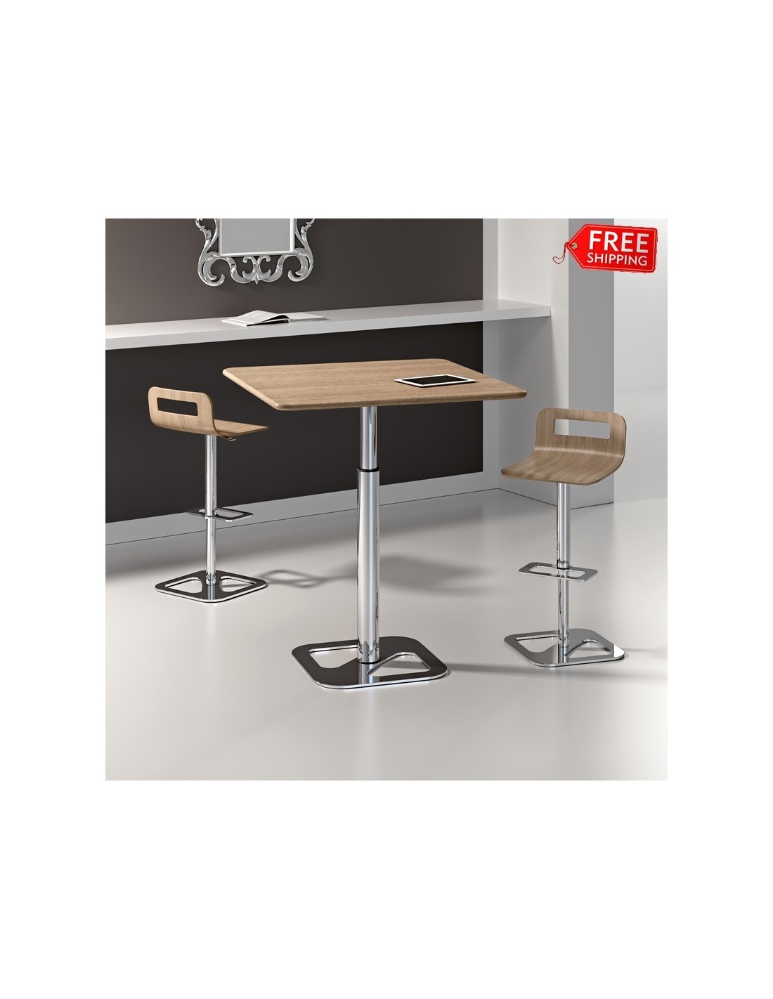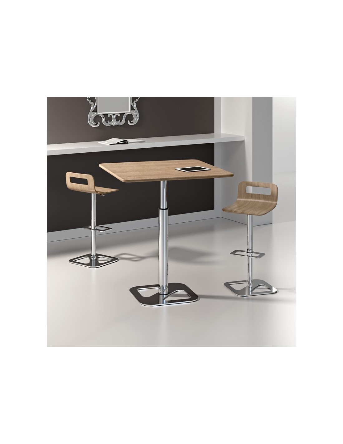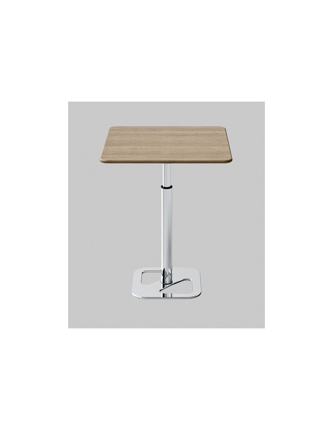 Tavolo regolabile in altezza con meccanismo a gas, piano in nobilitato, legno o effetto malta, struttura in metallo cromato, disponibile in due versioni di altezza.