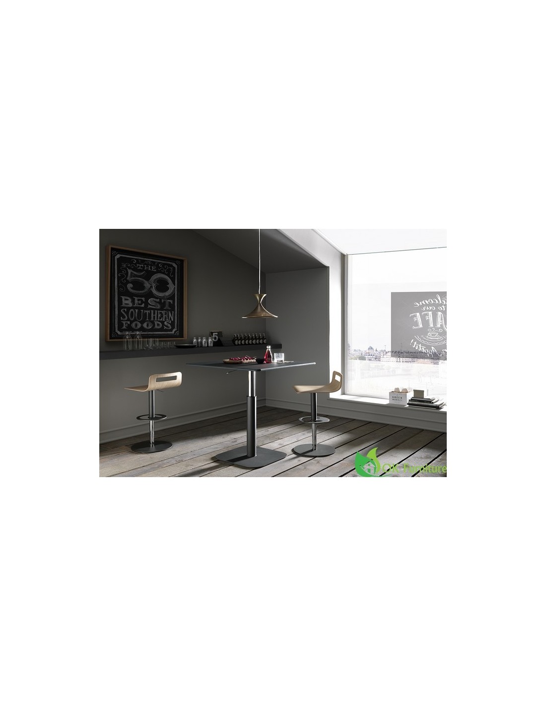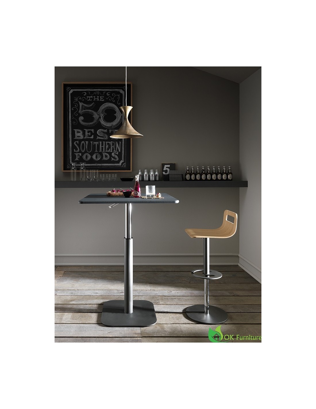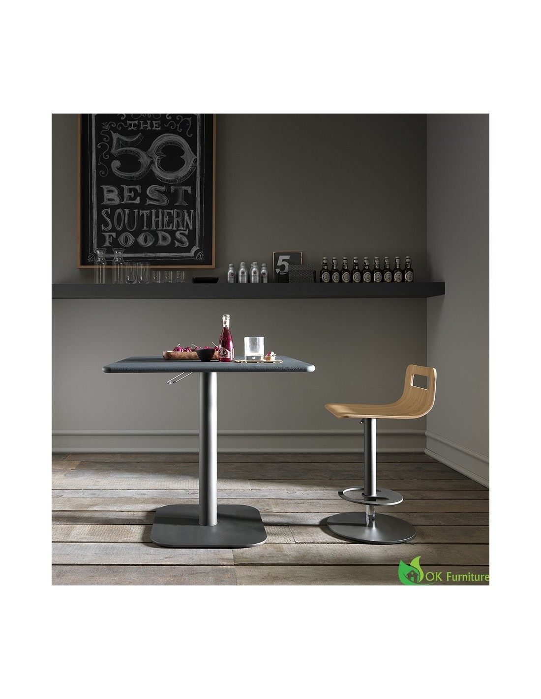 Tavolo regolabile in altezza con meccanismo a gas, piano in nobilitato, legno o effetto malta, struttura in metallo cromato, disponibile in due versioni di altezza.